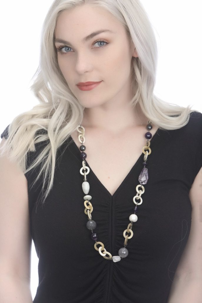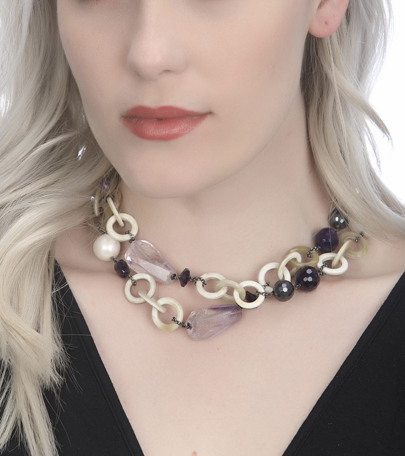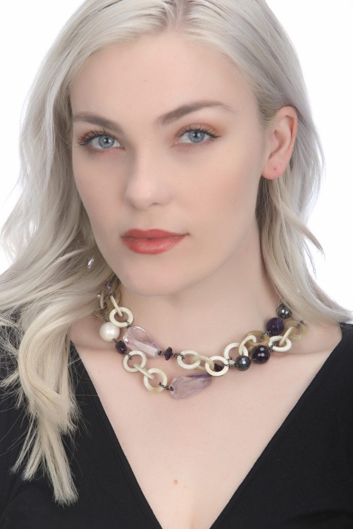 The Necklace can be worn long or doubled. Feel the love, energy, creativity and spirituality of Amethyst in this Italian Necklace. The Necklace is handmade with dark Sterling Silver that links horn, Pearls, Amethyst and numerous Quartz stones- all made by one of Italy’s best designers, Amlé. This Necklace has a clip that opens and closes the Necklace, making it easy to wear this Necklace long or doubled around your neck. Look hard- the clip fades right into the design of the Necklace. The Necklace is 33 inches long.