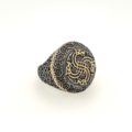 This is an oxidized Sterling Silver Ring that is accented with a pattern in a gold metal overlay. The pattern looks Celtic or Viking, with its intertwining circles. The Ring has a low cathedral mounting to give it the perception of some height without being overbearing. The interior of the Ring is hollow, to keep it from being heavy. The Ring is made by Ahmet in Istanbul. It is in Size 7 only.