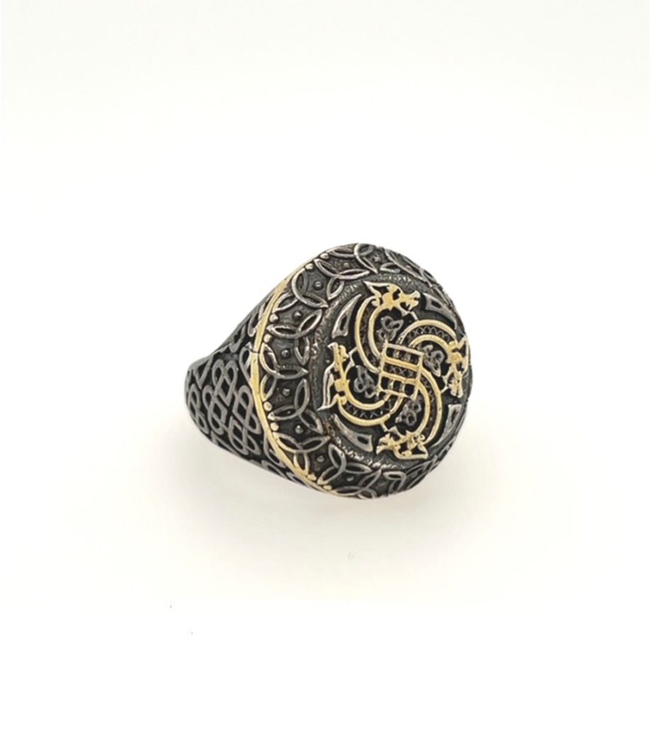 This is an oxidized Sterling Silver Ring that is accented with a pattern in a gold metal overlay. The pattern looks Celtic or Viking, with its intertwining circles. The Ring has a low cathedral mounting to give it the perception of some height without being overbearing. The interior of the Ring is hollow, to keep it from being heavy. The Ring is made by Ahmet in Istanbul. It is in Size 7 only.
