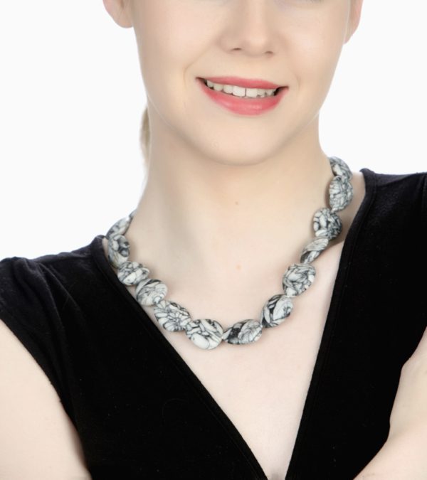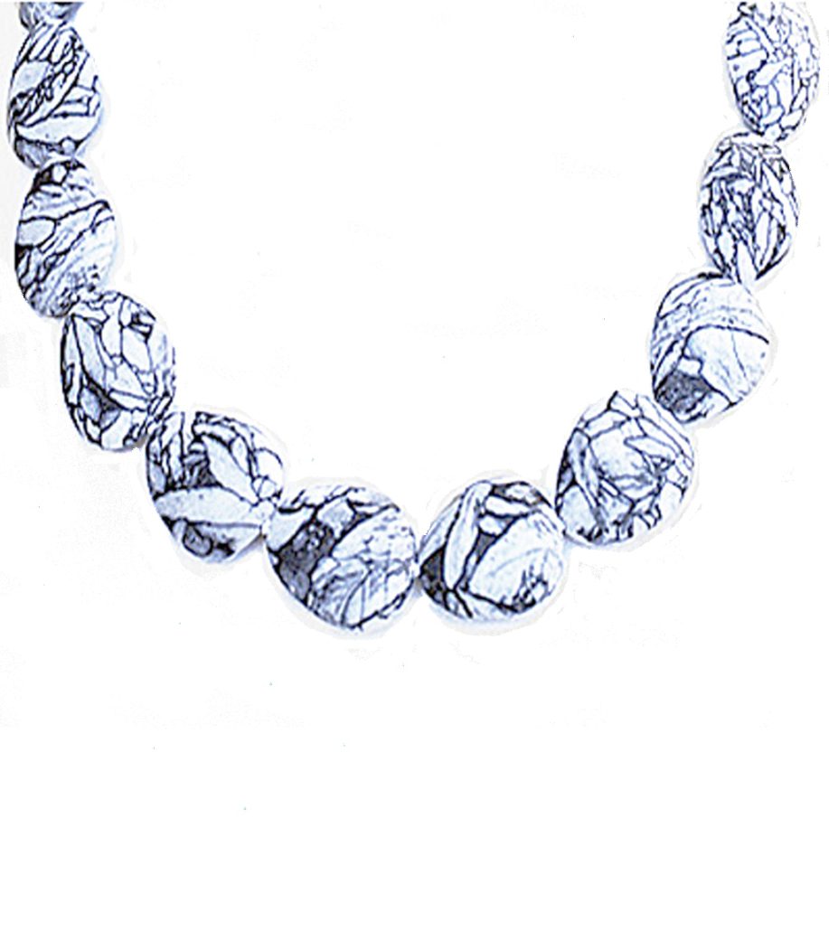 Feel that sense of beauty in this Austrian Necklace. This Necklace is made of Austrian river rocks which are strung on nylon and silk. The Necklace is 19 inches long with a Sterling Silver lobster claw clasp. The natural river rock is black and white in a pattern that makes for an incredible Necklace. Yes- this really is how these rocks naturally look! They are so beautiful.