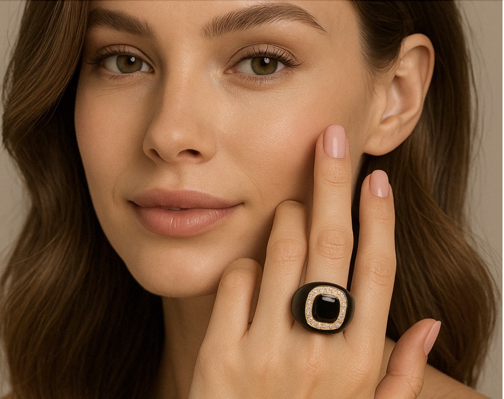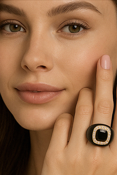 This Ring was made in a workshop in Italy. It is made in Sterling Silver with black enamel and a man-made black colored stone. The center black stone is surrounded by small white man-made stones. Tell us your Ring size and we will permanently adjust this Ring to your Ring size.