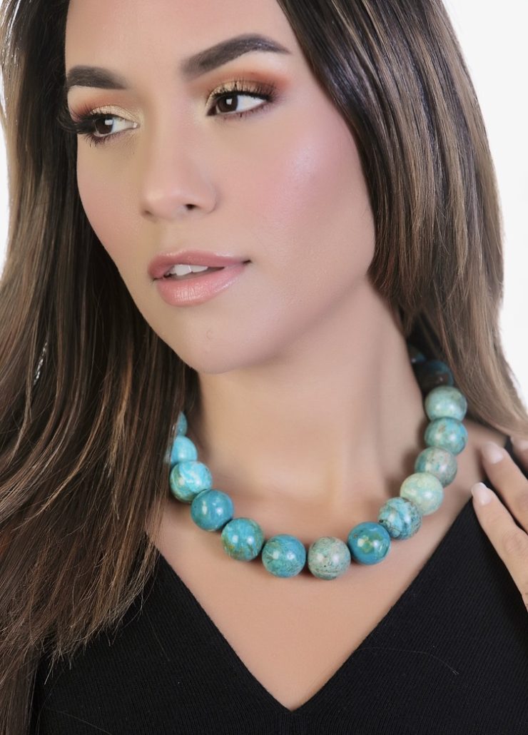 The Blue Opalina is said to look like peacock’s feathers. Both are so beautiful. The Blue Opalina stones are rare, found only in the Andes Mountains of Peru. It is said that amid emotional instability, the Blue Opalina stone is a balancing force. Others say that the Blue Opalina is a stone of creativity. Experience this incredible stone in a Necklace. The Necklace is adjustable, up to 18 inches long. The stones are strung on a sturdy wire that is coated with nylon. It is created by Resa Royale.