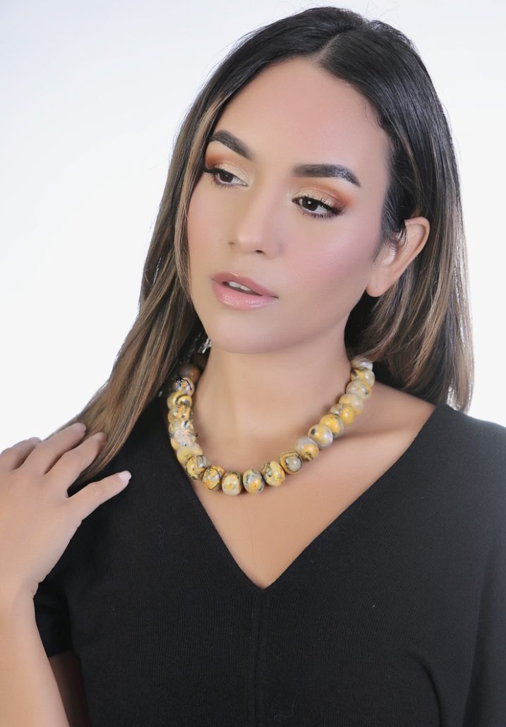 This Necklace is surrounded by Bumblebee Jasper stones. The stones are strung on metal wire coated with nylon for strength and durability. There is a Sterling Silver clasp with extra Sterling Silver links to adjust the length of the Necklace up to 18 inches long.