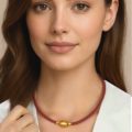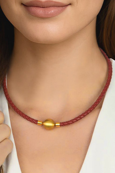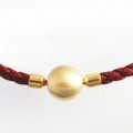 This is a maroon braided Leather Necklace. The Necklace is 16 1/2 inches long with an interlocking gold center ball. It is the work of the German jewelry designer, Rohde Schmuckwaren.