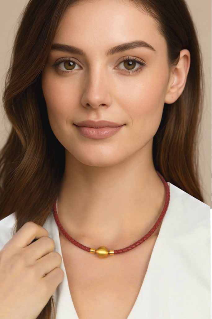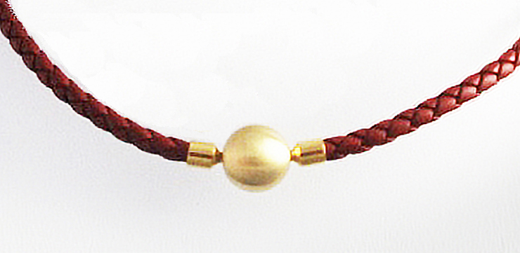 This is a maroon braided Leather Necklace. The Necklace is 16 1/2 inches long with an interlocking gold center ball. It is the work of the German jewelry designer, Rohde Schmuckwaren.