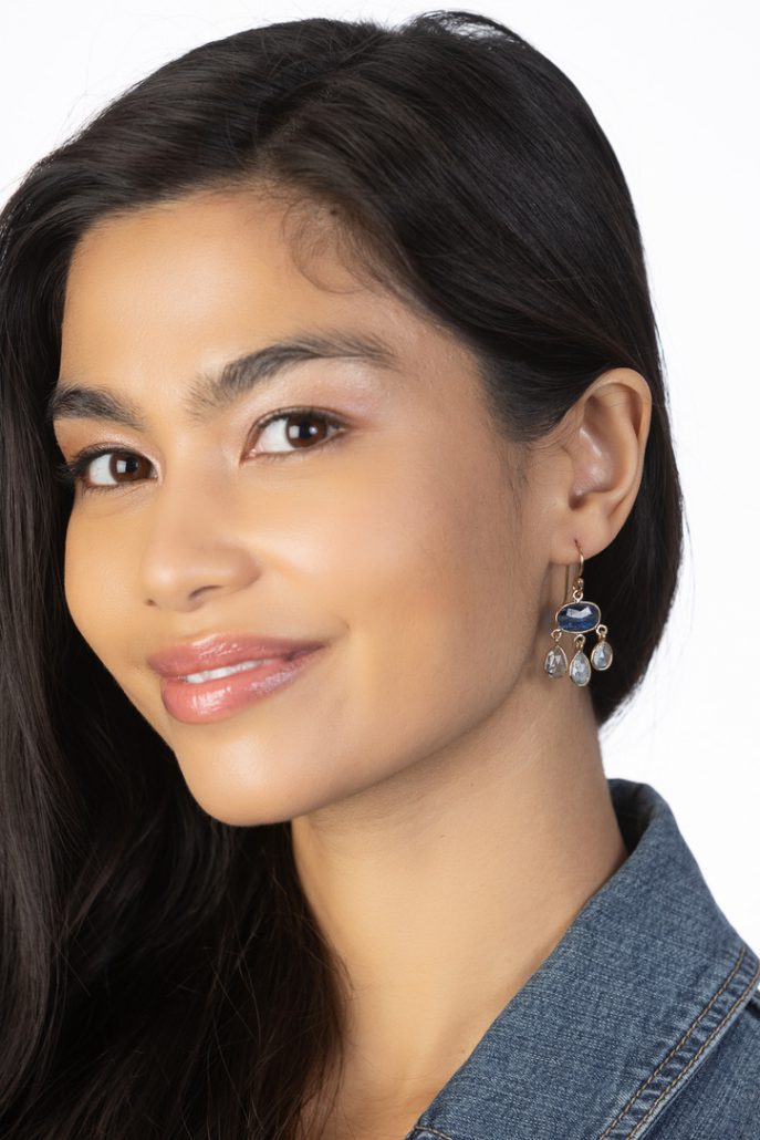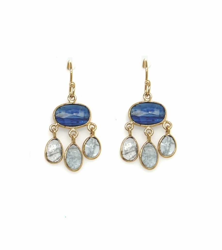 These fish hook backed Earrings are gold-plated with blue Kyanite stones, from which hang three Aquamarines for each Earring. These eye-catching Earrings are made by Niiki Paris in Paris, France. Fall in love with yet another wonderful thing from Paris.