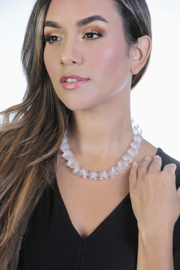 As ice forms on glass or sculpts the branches of a tree, so Clear Crystal Quartz is naturally created in the Earth. Its clear shine is cut into stones that are sculpted, to create this incredible Necklace. The stones are strung on metal wire that is coated with nylon. The Necklace has a Sterling Silver lobster claw catch and has large links to adjust the length. At its longest length, the Necklace is 18 inches long. These stones are said to be stones of energy. Feel the shine of the stones energize you as it creates eye-catching reflections.