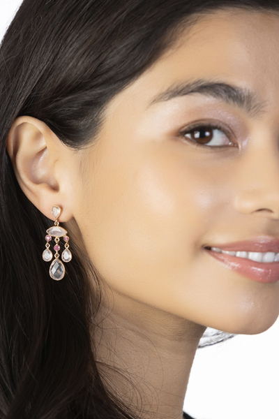 These French Earrings are made in Paris by Niiki Paris. The Earring are made in Moonstone and Rubies with a post back. Fall in love with the gemstones and the style of these Earrings, for every day and long into the night.