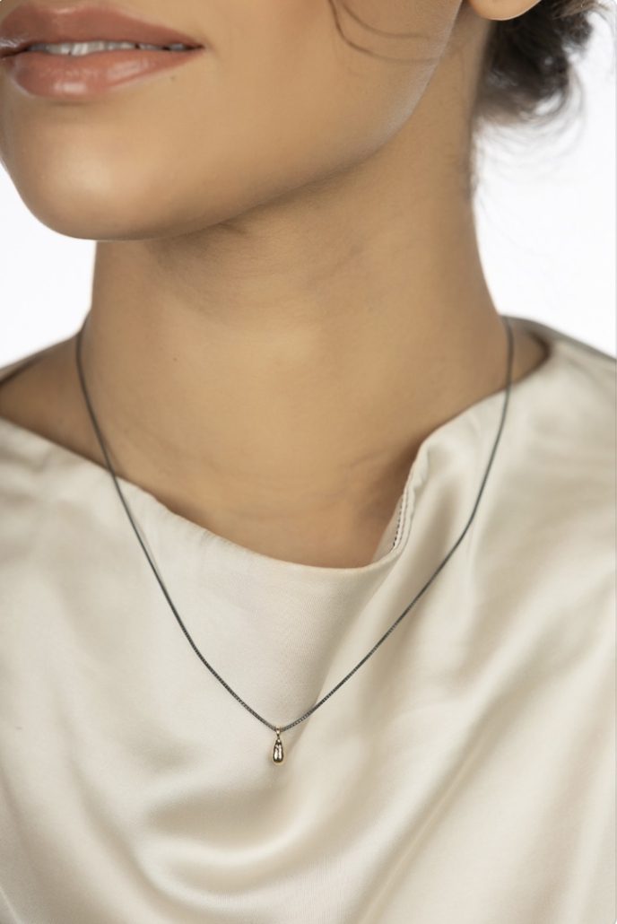 A 9K Yellow Gold drop hangs from an oxidized Sterling Silver Chain. This Necklace is adjustable from 16 to 18 inches in length. This Necklace is created by the mother and daughter team, Coby and Elselien, from the Netherlands.