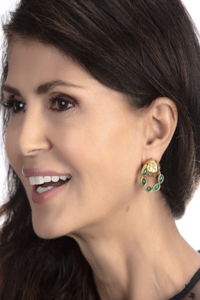These Earrings are created in brass with a gold overlay. A larger ball sits in the middle of these gold post Earrings. On either side of the center gold ball, connects a ribbon of green and gold. The green stones are man-made and translucent. The Earrings hang 1 1/4 inches long. They are made by Som Silver in Turkey. When the sultans ruled during the Ottoman Empire (14th-20th Centuries), foreign dignitaries came to see the sultans. Feel a sense of being an ambassador, as you wear these Turkish Earrings.