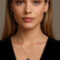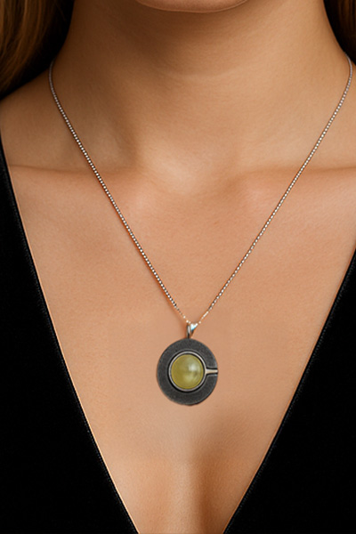 This Necklace has a round Pendant. The Pendant is made of oxidized Sterling Silver- or a darkened Sterling Silver. At the center of the Pendant is a Green Serpentine stone. Green Serpentine stones are semi-precious stones. This stone was mined in Norway. The Pendant is attached to a box chain. The chain is adjustable. It goes as long as 22 inches in length and can be made as short as you might like it. The chain is also made of Sterling Silver. Experience the beauty of nature, which Norway is all about, as you wear this Necklace.