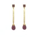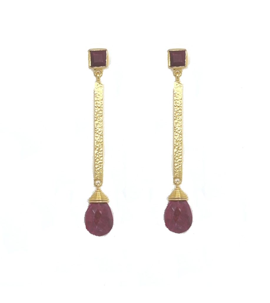 These French Earrings are gold-plated with an opaque Ruby at the top and bottom of each Earring. The Earrings have a post back. They are made in Paris, France by Niiki Paris. Fall in love with the color and sophisticated styling of French fashion.