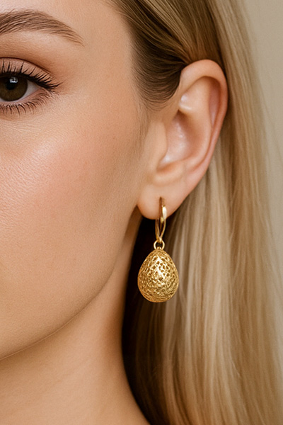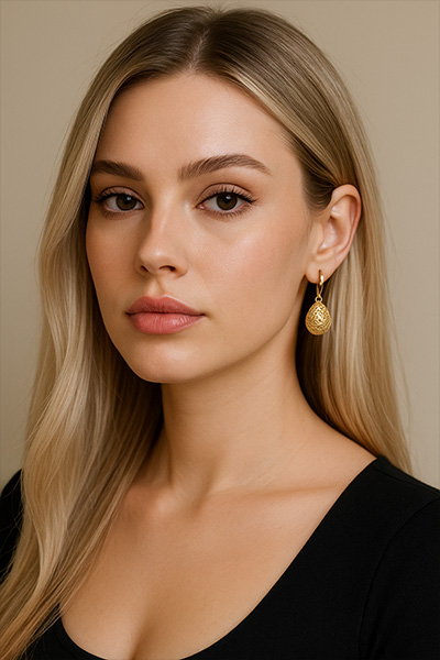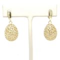 Oval gold balls with a cut out design in the balls, hang from these French Clip/ Omega back Earrings. The Earrings have a shimmer to them, as they move with your movements. An icy finish to the Earrings creates this most interesting and beautiful pair of Earrings. The Earrings are made by Vanessa Gioielli in Italy.