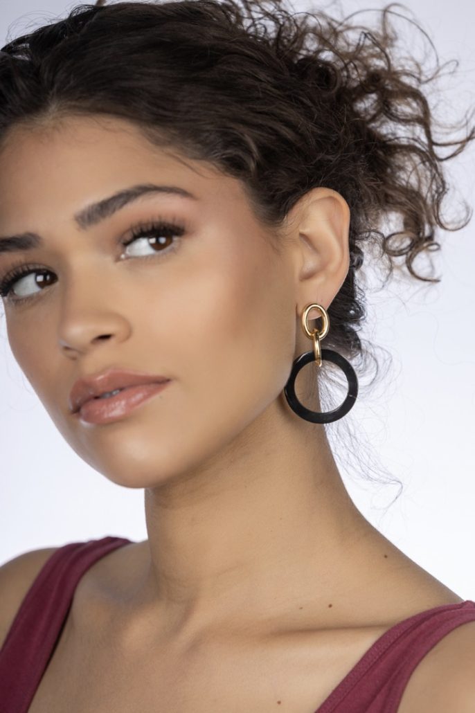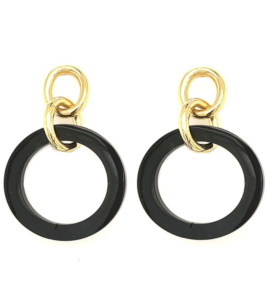 Black lacquered horn in a hoop attaches to interlocking gold plated Hoops on Sterling Silver. The Earrings have a large post back. They are handcrafted by Roberta, with the design company, Micheletto, in Milan, Italy.