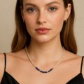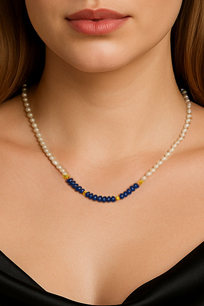 This Chinese made Necklace is created with blue Lapis Lazuli stones that hang against Freshwater Pearls. The Necklace has 16 inches of Lapis Lazuli stones and Pearls, with 2 inches of additional adjustment available, to lengthen the Necklace. Small gold beads highlight the design. This hand-crafted piece is just beautiful!