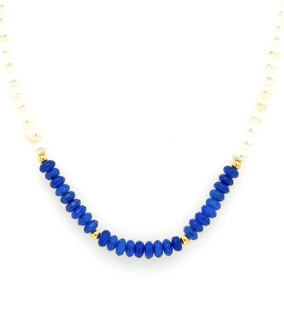 This Chinese made Necklace is created with blue Lapis Lazuli stones that hang against Freshwater Pearls. The Necklace has 16 inches of Lapis Lazuli stones and Pearls, with 2 inches of additional adjustment available, to lengthen the Necklace. Small gold beads highlight the design. This hand-crafted piece is just beautiful!