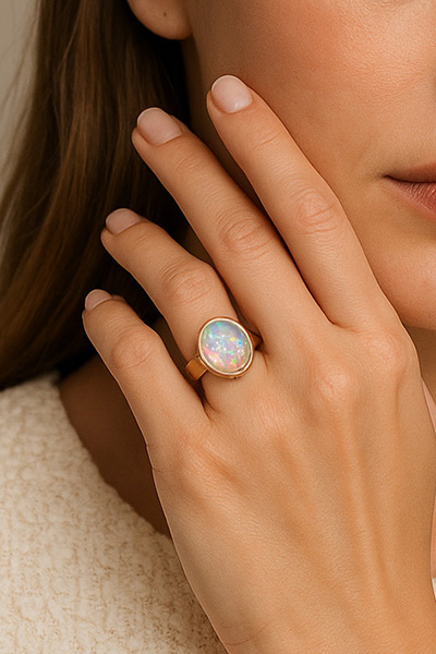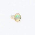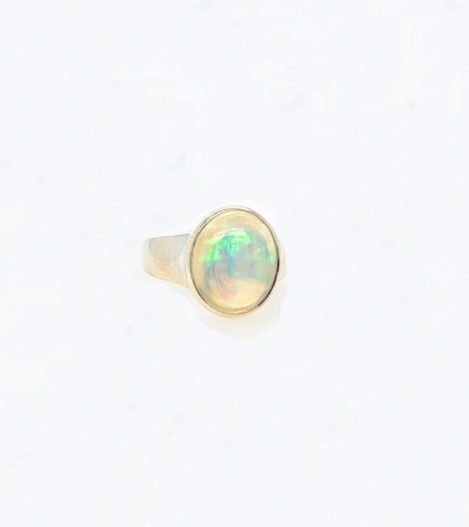 This Opal Ring is a cabochon cut with an oval shape. The Opal is set in a Sterling Silver Ring with a wider band for a more contemporary look. The Ring is Size 7. This Ring size can be modified for a reasonable fee.
