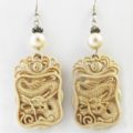 These Earrings are made from fossilized ivory, hand carved with dragons. Above the fossilized Ivory is a Pearl, all set on a Sterling Silver french wire back. The Earrings are 1 1/2 inches long from the top of the Pearl to the bottom of the Ivory. The carving on the Earrings is of a dragon. In Balinese folklore, a dragon represents power that is steeped in humility.