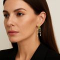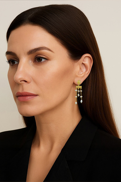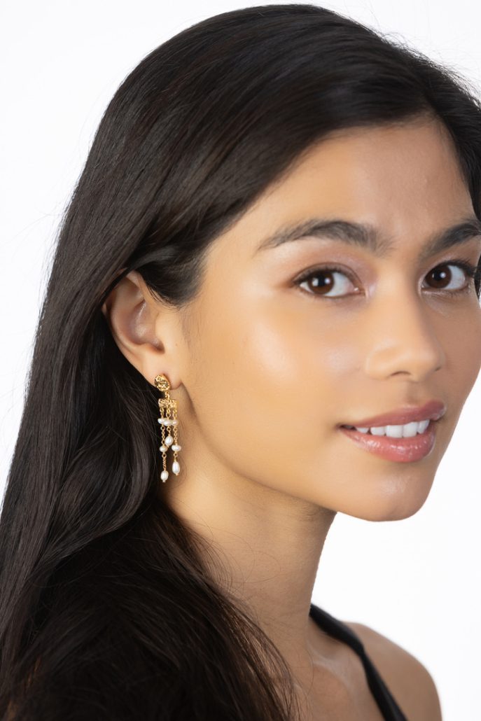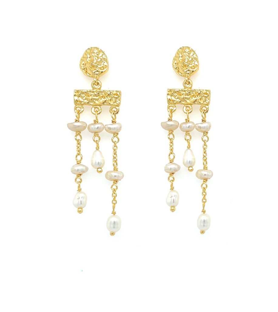 These French Earrings have small freshwater Pearls that hang from a gold-plated frame. The Earrings have a post back. These are elegant and interesting Earrings- with their movement through the links of the Earrings. They are made by Niiki Paris in Paris, France.