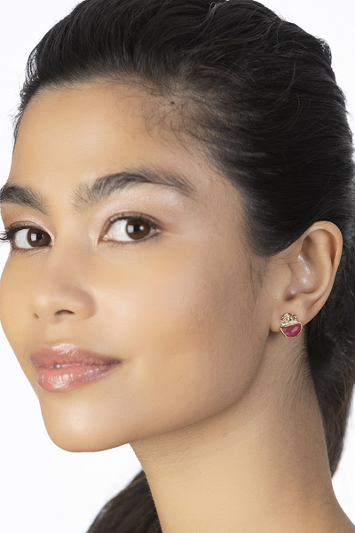 Pink colored Jade shines brightly in these French Earrings. Set on gold-plated posts, these Earrings are small and mighty. The Earrings are made in Paris, France by Niiki Paris. Feel the sense of artistry that is a part of these French Earrings.