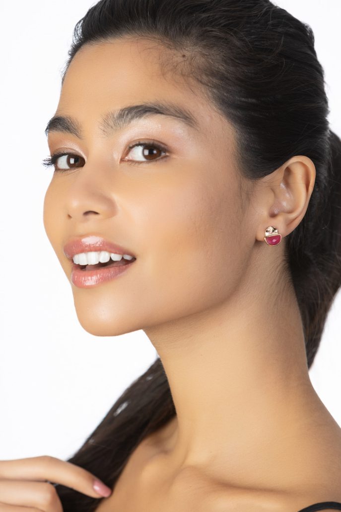 Pink colored Jade shines brightly in these French Earrings. Set on gold-plated posts, these Earrings are small and mighty. The Earrings are made in Paris, France by Niiki Paris. Feel the sense of artistry that is a part of these French Earrings.