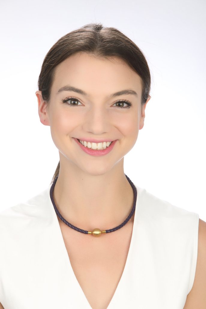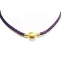 Feel a sense of the medieval married with today’s contemporary world in this purple braided German Leather Necklace. The interlocking ball at the center can be interchanged with other pieces. The Necklace is 16 1/2 inches long. The Necklace was created by Rohde Schmuckwaren in Germany.