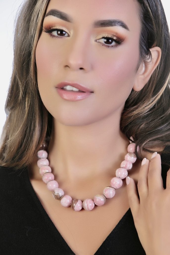 This is Rhodochrosite- these are stones created entirely in nature, in their beautifully attired pink, brown, beige and white coloring. Rhodochrosite stones are mined in Argentina. They are considered the “natural gemstones” of Argentina. These are said to be stones of emotional happiness. This Necklace is strung on wire with a nylon coating for strength and durability. There is a lobster claw closure that connects with Sterling Silver links, to adjust the length of the Necklace up to 18 inches long. This Necklace is created by Resa Royale.