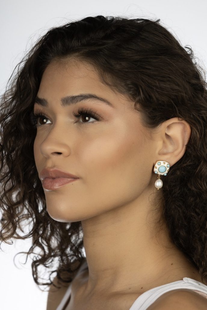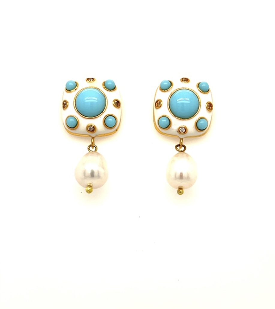 Baby Blue and White Enamel cover brass in these Turkish Earrings. The Earrings have man-made Pearls that hang from posts. These unique and pretty Earrings were created by Sebastian in Istanbul, Turkey.