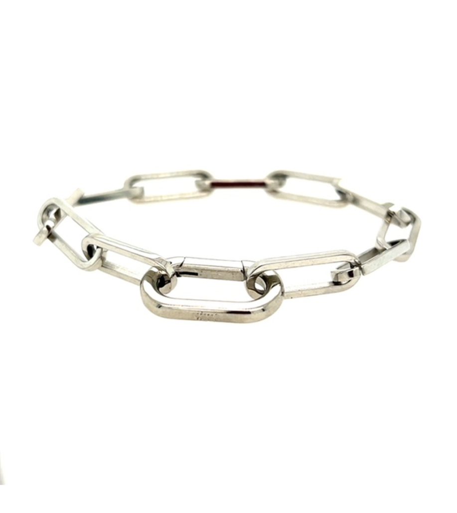 This Bracelet is made of Stainless Steel. That should be a pretty strong Bracelet for all that your day brings! The Bracelet is made with oblong links. The largest of the links is hinged for an easy on and off of this Bracelet. This Bracelet is 7 inches long. It is created by Julius in Taiwan.