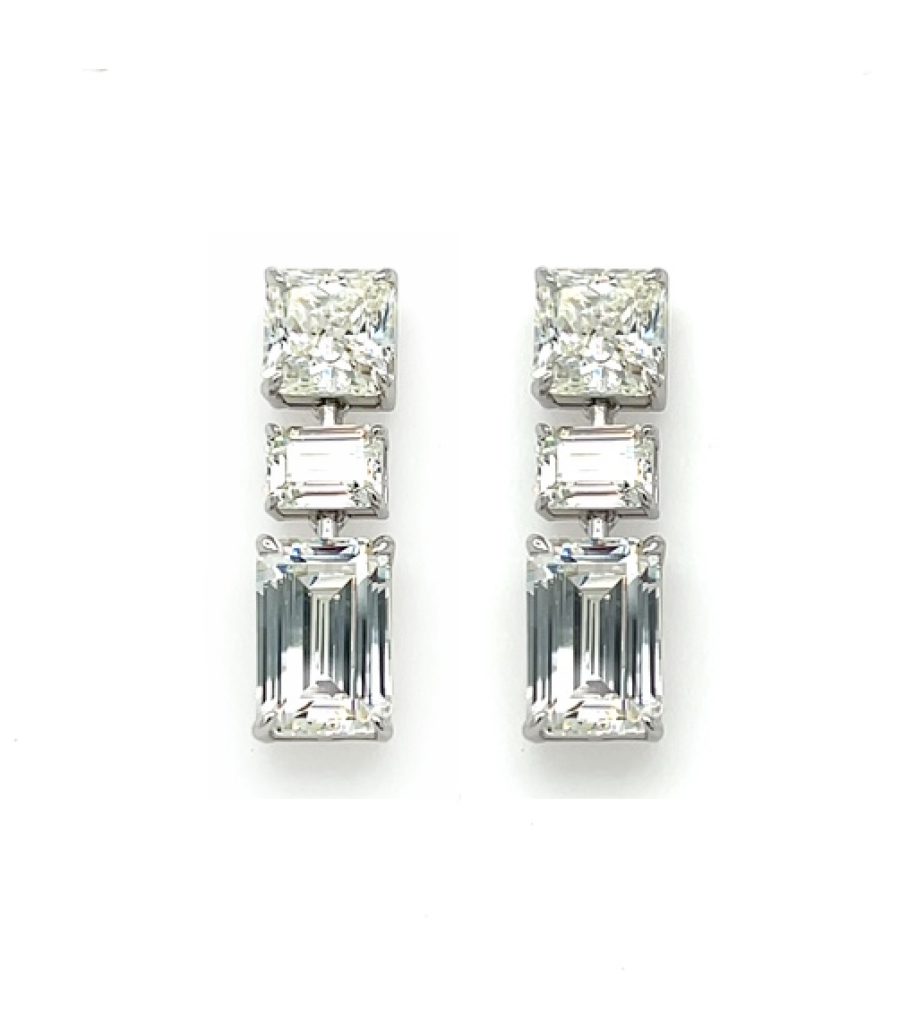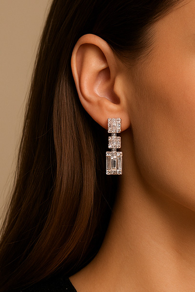 These diamond-like stones are man-made and are brilliant in color and cut. The three-tiered stones are set in a Sterling Silver frame. The Earrings have a post back. These are Earrings as incredible as they look.