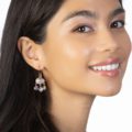 Hanging on a gold-plated frame, these French Earrings have a center stone of Rose Quartz from which hang Rainbow Moonstones, with a blue shine to them. The Earrings have a fish hook back. Like so many wonderful things, these Earrings are made in Paris, France. They were created by Niiki Paris.