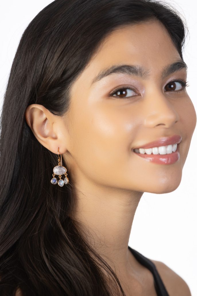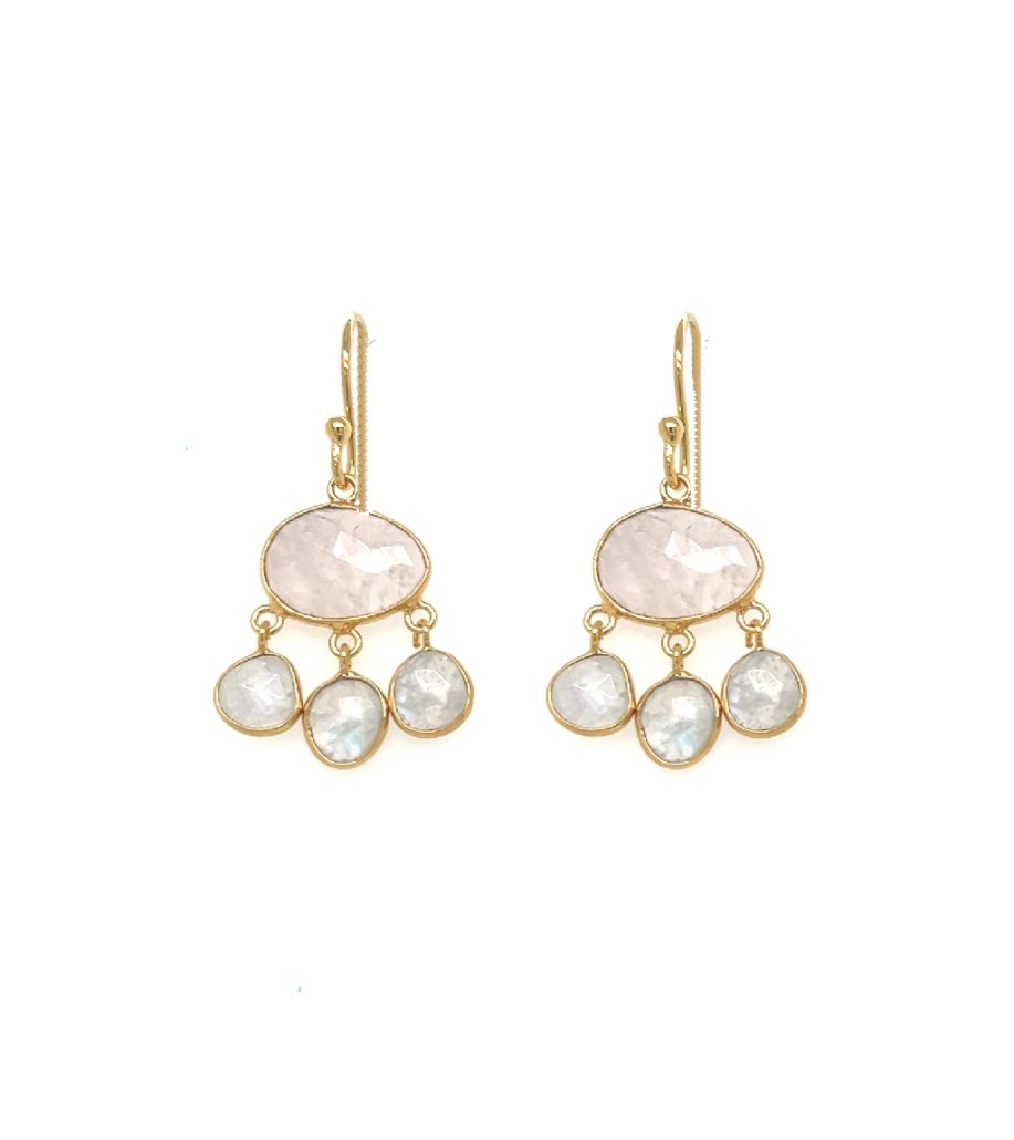 Hanging on a gold-plated frame, these French Earrings have a center stone of Rose Quartz from which hang Rainbow Moonstones, with a blue shine to them. The Earrings have a fish hook back. Like so many wonderful things, these Earrings are made in Paris, France. They were created by Niiki Paris.