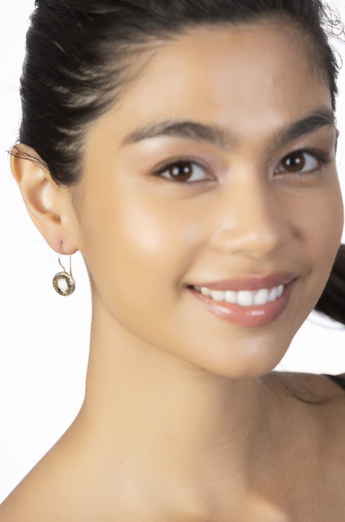These are round faceted Yellow Quartz Stones set in Sterling Silver. The Earrings pick up the light as you move. The Earrings have a fish hook back. They are made by Cornelia in Knysna, South Africa.